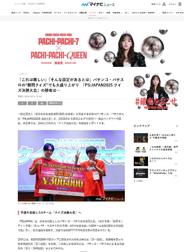 学遊連主催の学生ぱちんこ大会「PS:JAPAN2025」決勝大会がマイナビニュースで掲載されました。