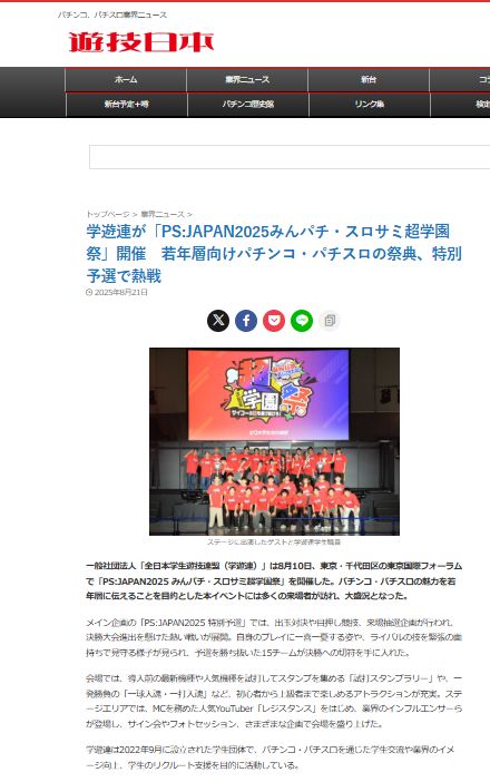 お知らせ「PS:JAPANみんパチ・スロサミ特別予選&超学園祭」が遊技日本で掲載されました。