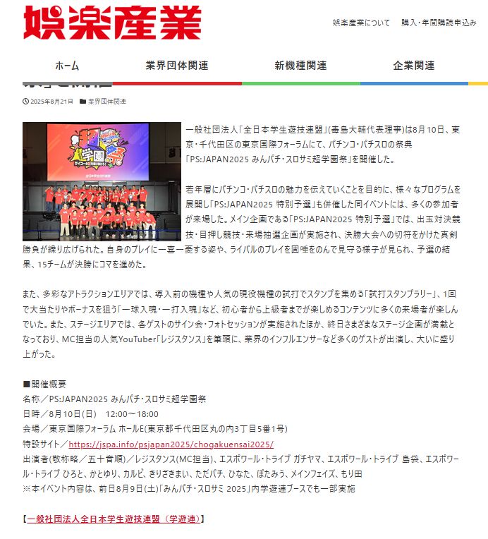 リンク先:https://www.goraku-sangyo.com/%e5%ad%a6%e9%81%8a%e9%80%a3%e3%80%80%e3%80%8cpsjapan2025-%e3%81%bf%e3%82%93%e3%83%91%e3%83%81%e3%83%bb%e3%82%b9%e3%83%ad%e3%82%b5%e3%83%9f%e8%b6%85%e5%ad%a6%e5%9c%92%e7%a5%ad%e3%80%8d%e3%82%92/